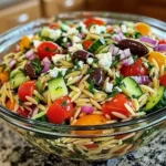 A refreshing and vibrant orzo pasta salad loaded with juicy tomatoes, crunchy cucumbers, briny olives, and creamy feta—ideal for summer gatherings, meal prep, or a light lunch.